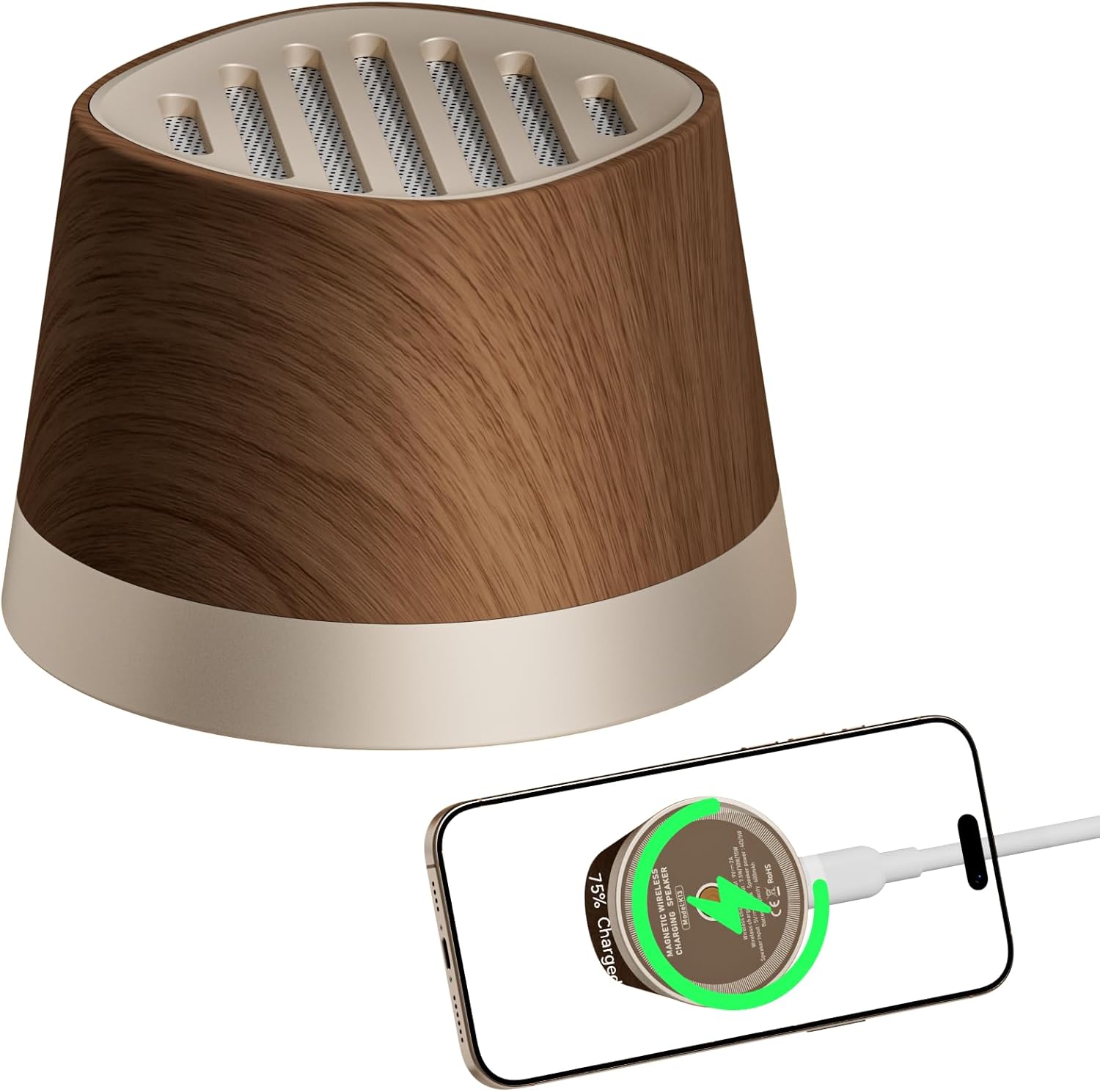 Sonido envolvente con tecnología TWS, cargador inalámbrico compatible con iPhone, diseño elegante en madera, soporte para móvil.