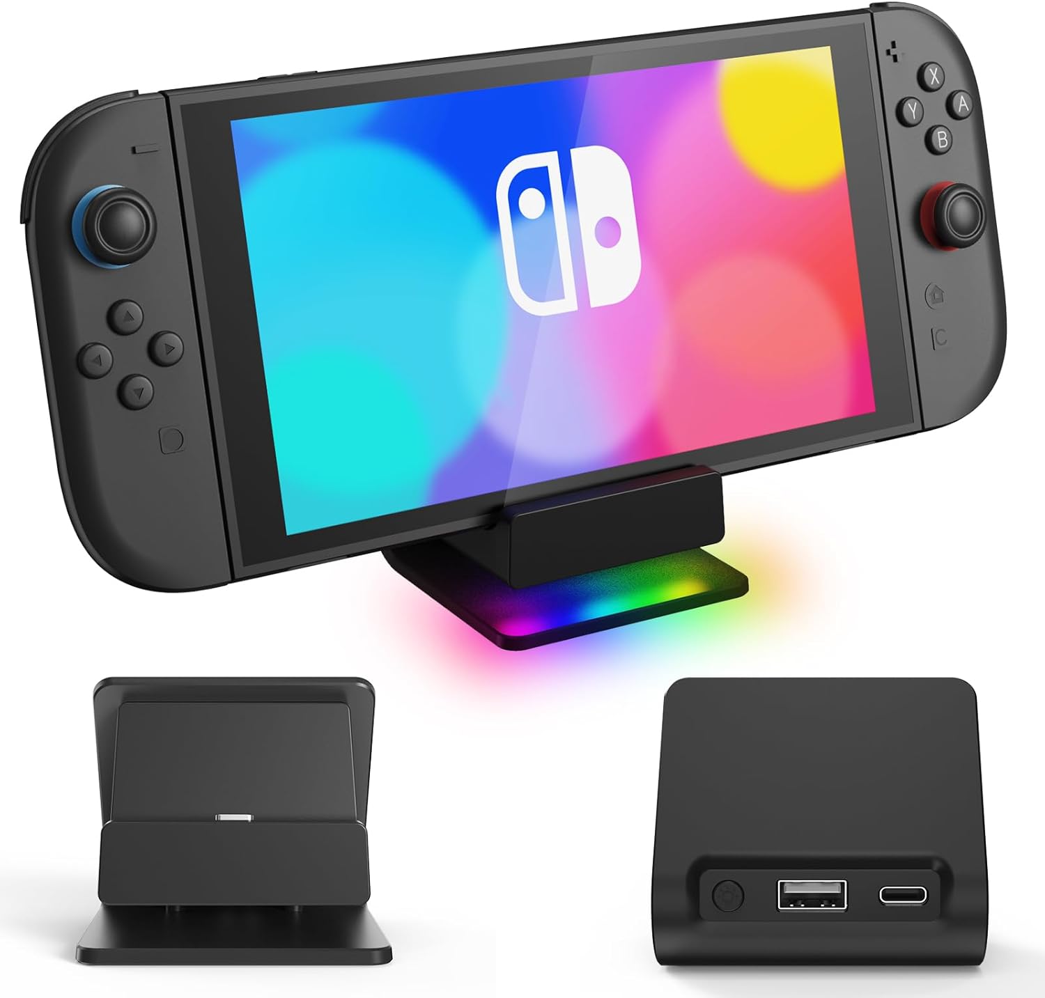 Descubre la base de carga mini para Nintendo Switch 2, perfecta para mantener tu consola en la mejor posición mientras juegas. Con un diseño compacto y elegante, esta base ofrece siete modos de iluminación RGB para darle un toque único a tus sesiones de juego. Además, cuenta con un puerto USB 2.0 que permite la conexión de otros dispositivos, todo sin comprometer la estabilidad gracias a su base antideslizante.
