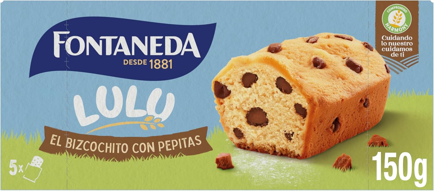 Descubre el delicioso mundo de los bizcochitos Fontaneda Lulú, ideales para tus momentos de merienda o desayuno. Cada pack incluye dos cajas de 150g, con un total de 10 unidades individuales. Su textura esponjosa y las irresistibles pepitas de chocolate harán que cada bocado sea un placer. Perfectos para disfrutar en cualquier ocasión.