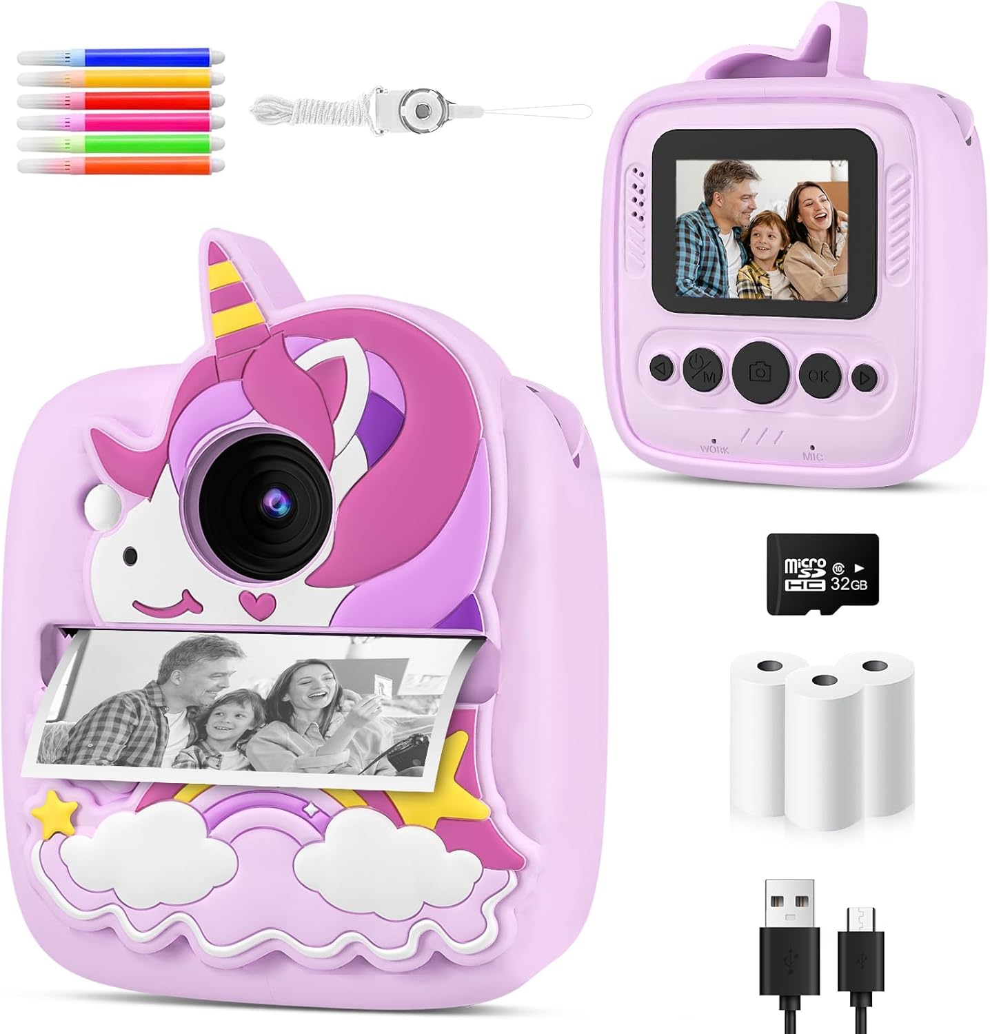 ¡Haz que los más pequeños se diviertan creando recuerdos con esta increíble cámara infantil! Diseñada específicamente para ellos, cuenta con un sensor de 48MP y una pantalla de 2 pulgadas que les permitirá capturar imágenes nítidas y divertidas. Además, imprime fotos en blanco y negro al instante, graba vídeos en 1080p y permite añadir marcos y efectos creativos. Incluye todo lo necesario para comenzar a usarla: papel fotográfico, funda de silicona protectora y tarjeta SD de 32GB.