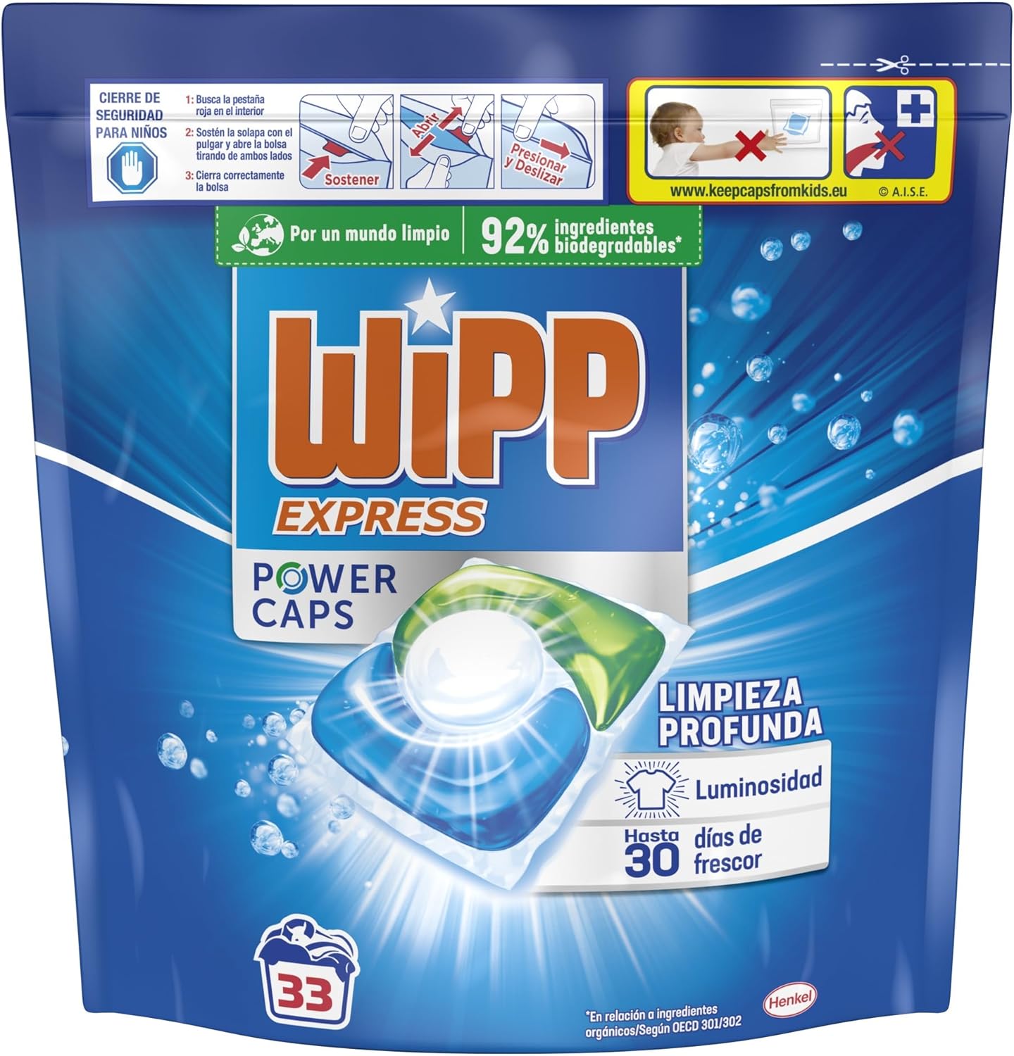 Descubre la eficacia del detergente Wipp Express con este práctico pack de 2. Cada paquete contiene 33 cápsulas que garantizan una limpieza profunda, incluso en agua fría. Perfectas para cualquier tipo de ropa. Además, ¡aprovecha el increíble 70% de descuento en la segunda unidad!