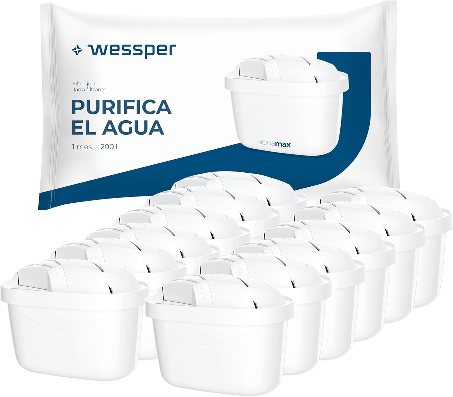 Optimiza la calidad de tu agua con estos cartuchos de Wessper. Este pack incluye 12 filtros que utilizan carbón activo y resina ionizante para garantizar un agua más pura y sabrosa. Son compatibles con jarras Brita, Dafi y otras, lo que los convierte en una opción versátil y conveniente para tu hogar.