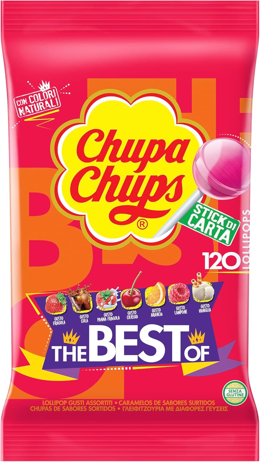 Disfruta de los clásicos Chupa Chups Original en un práctico formato de 120 unidades. Perfectos para fiestas, eventos o simplemente para tener siempre a mano. Con una deliciosa variedad de sabores frutales y cremosos, son ideales para todos los gustos. Además, su formato ahorro te permitirá disfrutar de mucho más por menos.