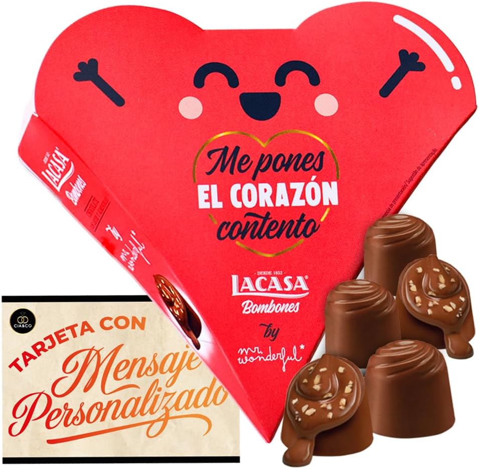 Descubre el corazón de bombones LaCasa, un regalo ideal para expresar tus sentimientos. Con diseños exclusivos de Mr. Wonderful y frases encantadoras como 'Me pones el corazón contento' y 'Eres mi persona favorita', este detalle hará sonreír a cualquier persona. Además, incluye una tarjeta dedicada personalizable, lo que lo convierte en un regalo verdaderamente único.