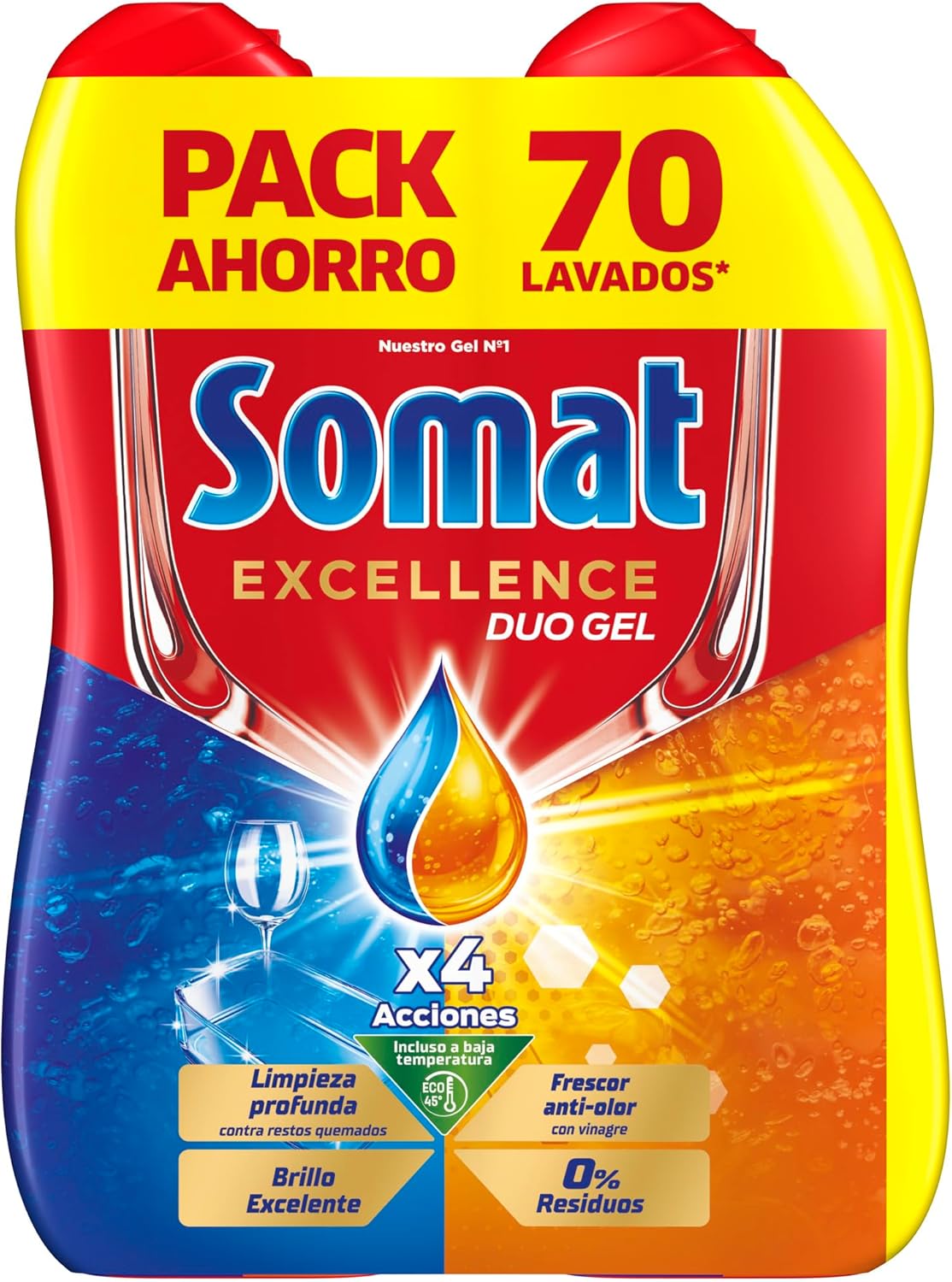 Descubre la eficacia del detergente para lavavajillas Somat Excellence Gel Frescor. Con capacidad para 70 lavados, su fórmula desengrasante con vinagre garantiza una limpieza profunda y un frescor duradero en tus utensilios de cocina. Perfecto para lavavajillas automáticos, es la solución ideal para mantener tu vajilla impecable.