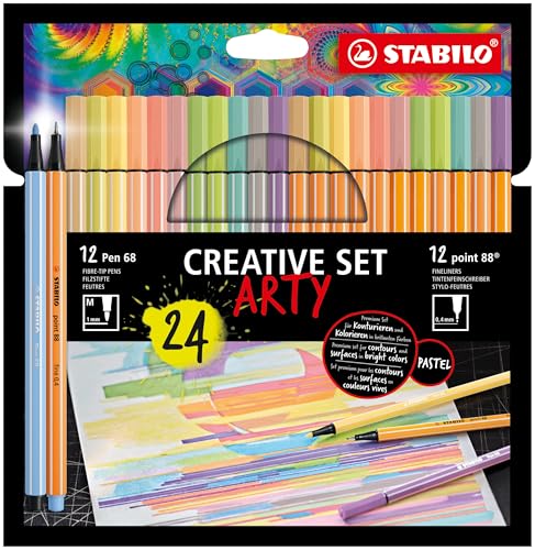 Descubre el estuche de 24 rotuladores STABILO, perfecto para estudiantes y creativos. Incluye 12 rotuladores de punta fina point 88 en colores pastel y 12 rotuladores premium Pen 68, combinando precisión y intensidad en cada trazo. ¡No te pierdas esta oferta!