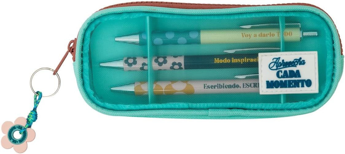 Descubre la combinación perfecta de estilo y funcionalidad con este estuche que incluye 3 bolígrafos metálicos. Su diseño de rejilla transparente con cierre de cremallera lo convierte en el accesorio ideal para tu día a día. Ya sea en la oficina o en casa, sus bolígrafos de tinta azul y negro, con mensajes motivadores, te acompañarán en cada momento. ¡Haz que la organización sea parte de tu rutina!