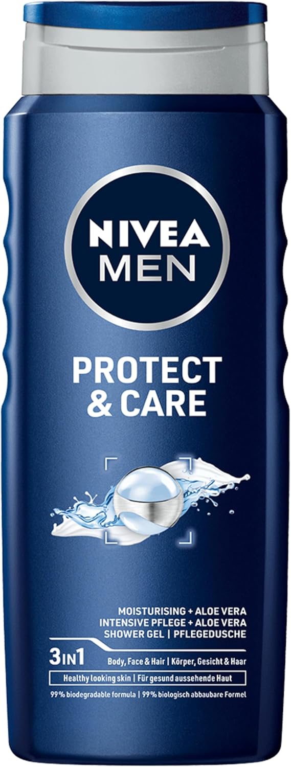 Descubre el gel de ducha NIVEA Protect & Care, una solución 3 en 1 que limpia tu cara, cuerpo y cabello. Con su formato de 500ml, es perfecto para todo tipo de piel. Aprovecha el descuento especial y ahorra en tu compra.