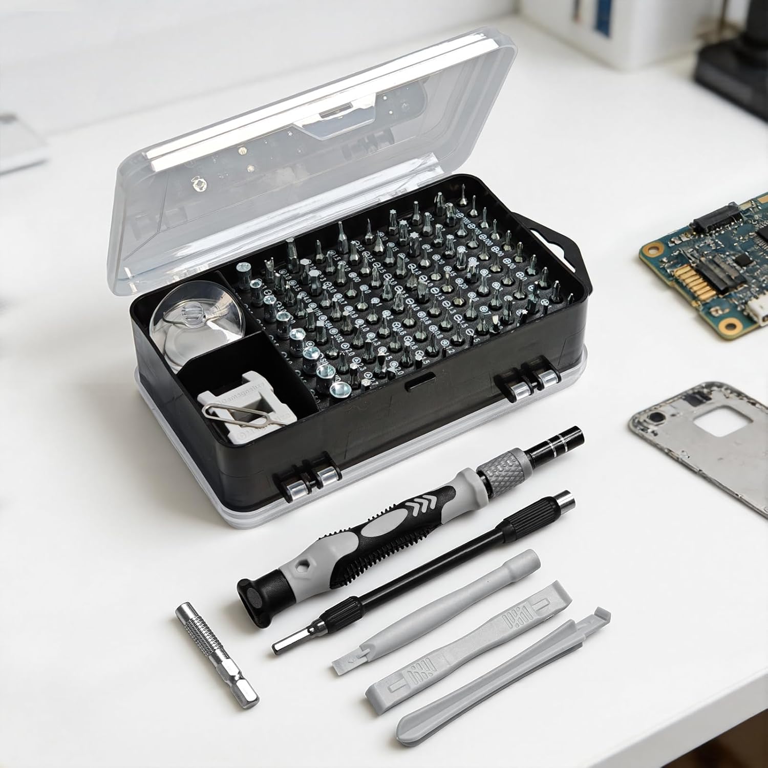 Este completo juego de destornilladores de precisión cuenta con 115 herramientas en 1, ideal para realizar reparaciones en dispositivos electrónicos como móviles, relojes, cámaras y consolas. Su diseño compacto y magnético lo hace perfecto para llevar a cualquier parte y utilizar en cualquier momento. Además, incluye puntas intercambiables Torx para mayor versatilidad en tus reparaciones.