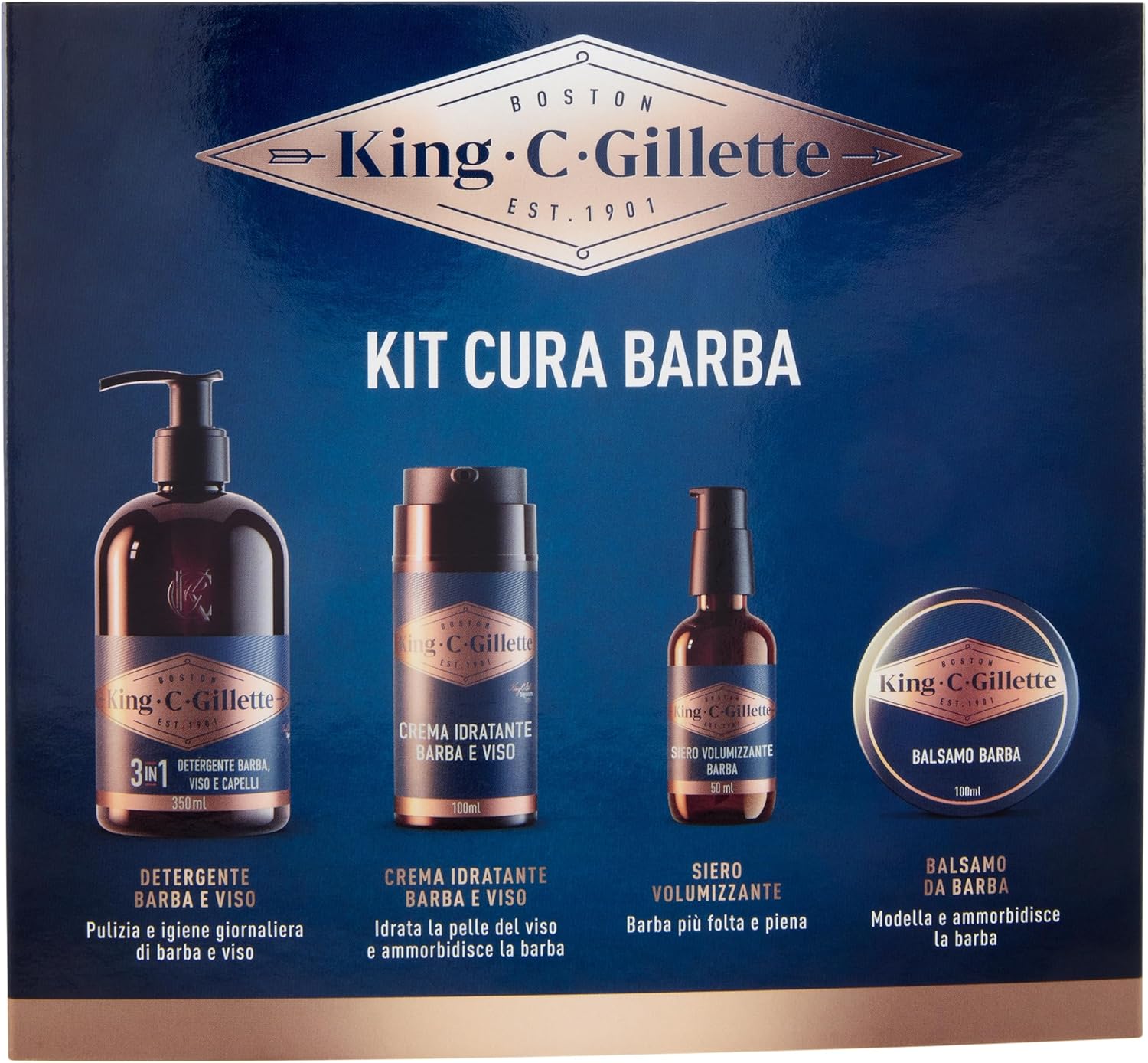 Transforma tu rutina de cuidado personal con el kit de King C. Gillette. Este conjunto incluye un limpiador 3 en 1 para barba y rostro, un bálsamo nutritivo, un suero voluminizador y una crema hidratante, todos formulados para mantener tu barba en óptimas condiciones y con un aroma fresco. Ideal para hombres que buscan lo mejor en su cuidado diario.