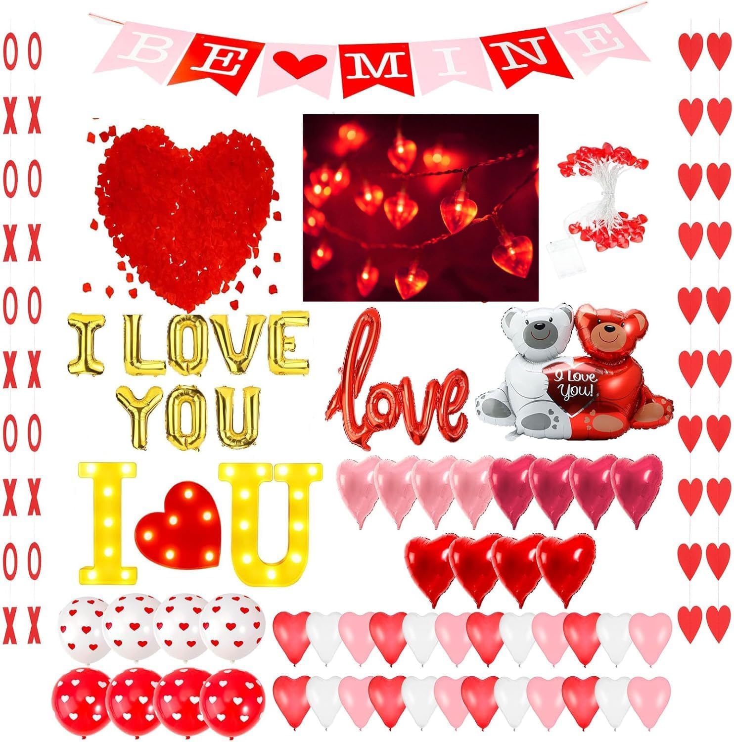 Transforma tu celebración del amor con este espectacular kit de decoración para San Valentín. Incluye una cadena de luces LED que aporta un ambiente acogedor, 2000 pétalos de rosa que añaden un toque de elegancia, una guirnalda de corazones XO y un panel luminoso que expresa tu amor con el mensaje 'TE AMO'. Además, los globos de aluminio en forma de corazón son el complemento perfecto para hacer de tu propuesta, boda o aniversario un momento memorable.