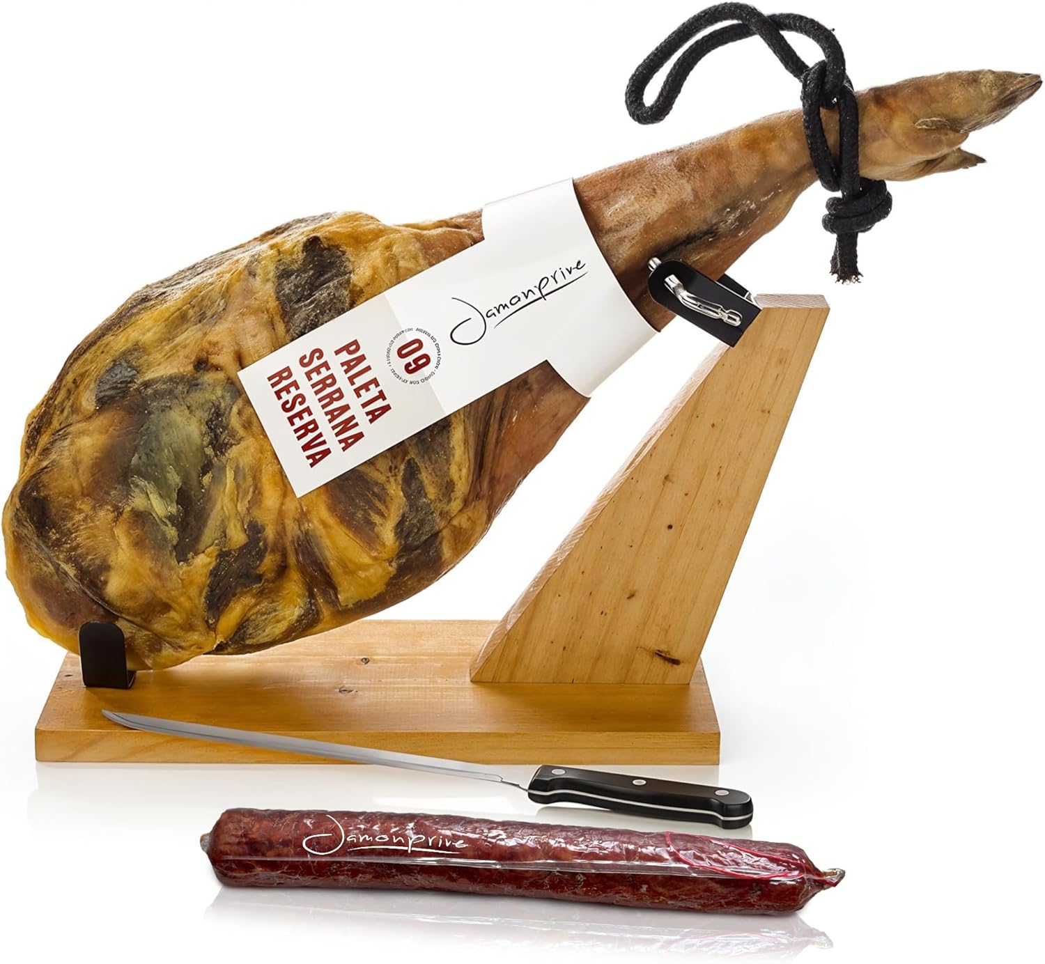 Incluye soporte jamonero, chorizo ibérico de regalo, ideal para celebraciones y tapas.