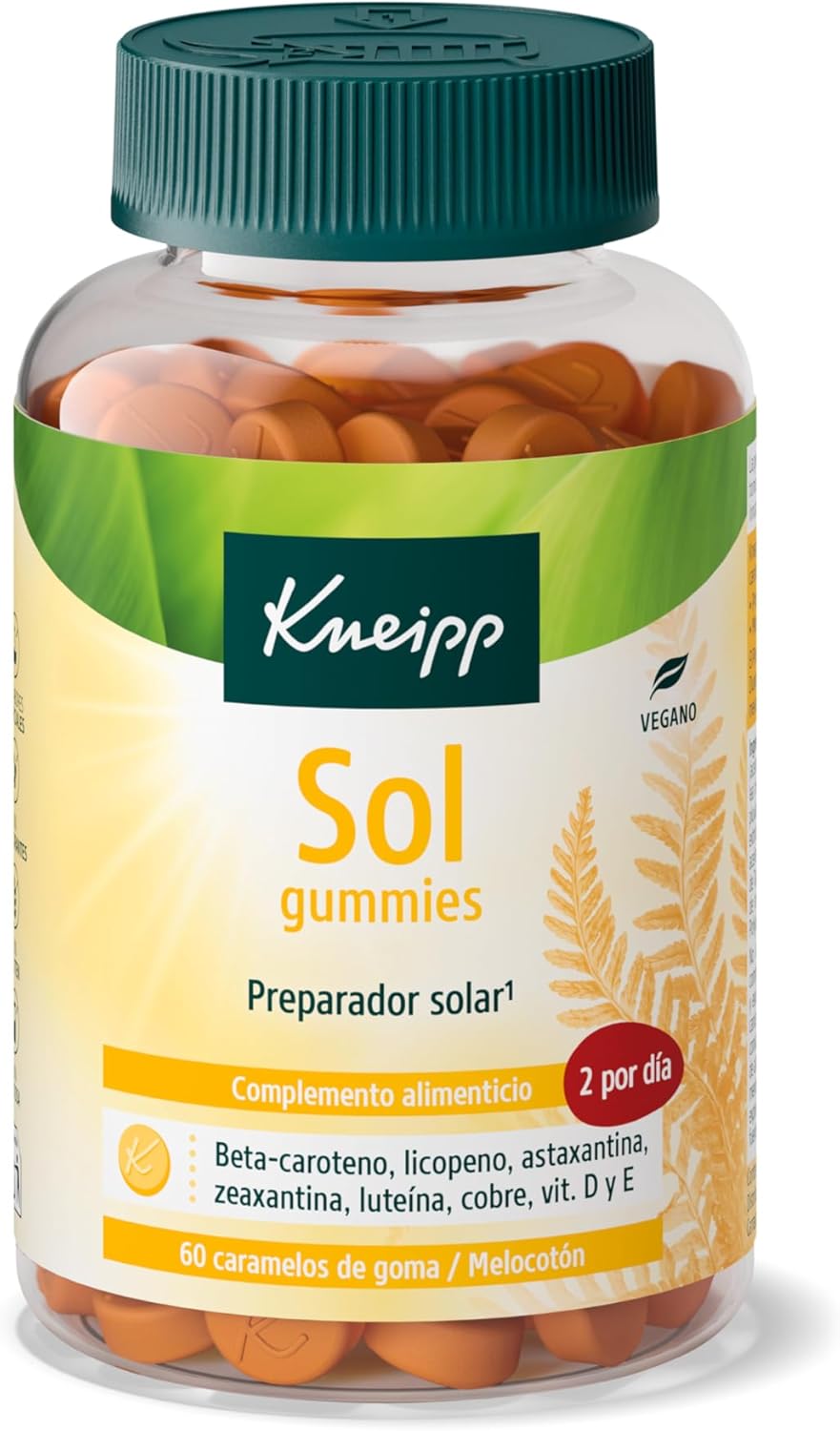 Prepárate para el verano con Kneipp Sun Gummies, unas gominolas que cuidan tu piel mientras disfrutas del sol. Con una combinación de Vitamina E y Cobre, estas gominolas ofrecen una excelente fotoprotección y ayudan a combatir el estrés oxidativo gracias a los carotenoides. Presentadas en un delicioso sabor melocotón, son ideales para acompañarte en tus días de playa. ¡No dejes pasar esta oportunidad de cuidar tu piel!