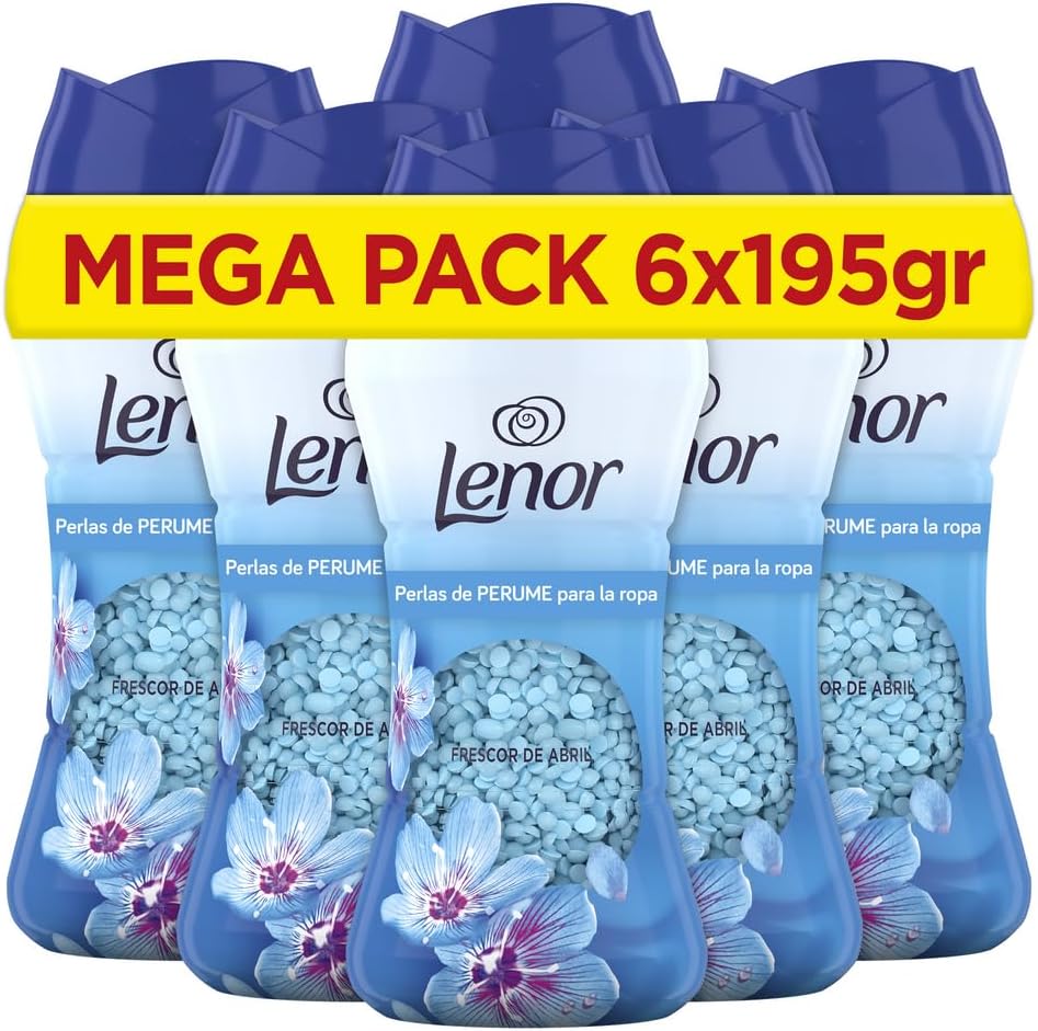Descubre el pack de 6 botes de perlas de perfume Lenor Unstoppables, con una fragancia de Frescor de Abril que potencia la frescura de tu ropa. Cada bote permite hasta 96 lavados, asegurando un aroma duradero en tus prendas.