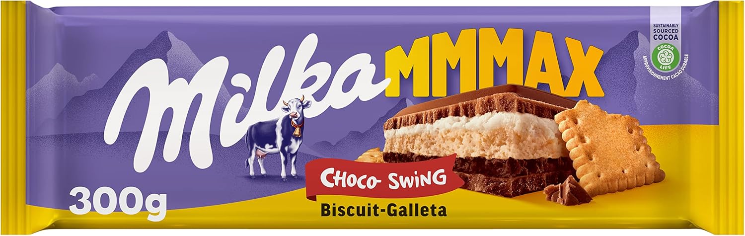 Disfruta de la exquisita tableta de chocolate Milka MMMAX Choco Swing, elaborada con leche de los Alpes, galleta crujiente y un delicioso relleno de crema de leche y cacao. Con un tamaño de 300g, es perfecta para compartir en cualquier ocasión. Aprovecha la oferta actual y no te pierdas un 70% de descuento en la segunda unidad al añadir dos a tu cesta.