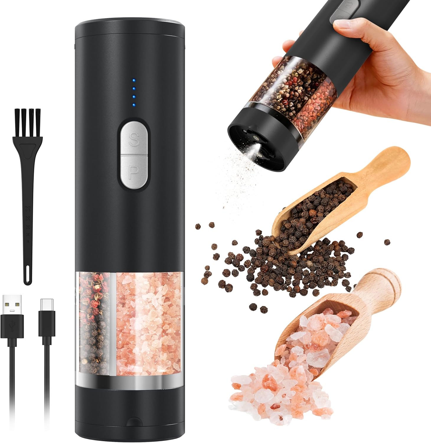 Mejora tu experiencia culinaria con este práctico molinillo eléctrico 2 en 1 para sal y pimienta. Diseñado para ser recargable por USB, te olvidas de las pilas y disfrutas de un uso cómodo gracias a su funcionamiento con una sola mano. Además, su iluminación LED integrada no solo es funcional, sino que también aporta un toque moderno a tu cocina. Perfecto para quienes buscan comodidad y estilo en la preparación de sus platos.