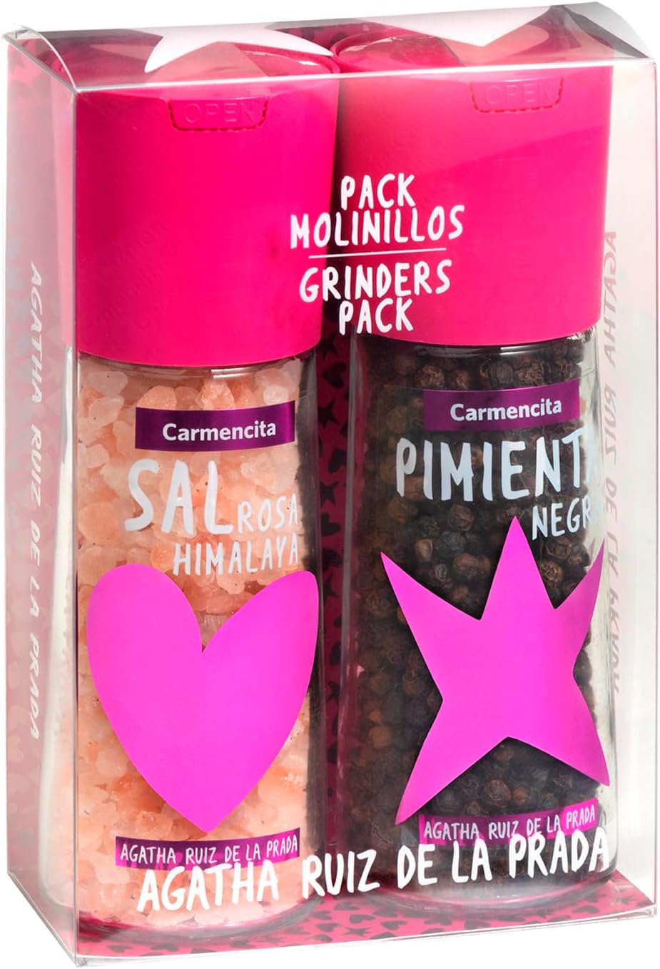Descubre el sabor auténtico en tu cocina con este pack de dos molinillos de sal rosa del Himalaya y pimienta negra, diseñados por Agatha Ruiz de la Prada. Con un total de 150 g, cada molinillo no solo aporta un toque de sabor, sino también un diseño único que alegrará tu mesa. ¡Haz que tus platos sean memorables!