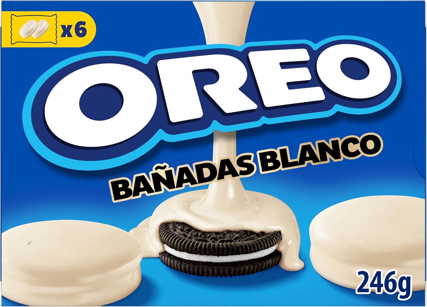 Disfruta de unas irresistibles galletas de chocolate con relleno de crema de vainilla, bañadas en deliciosa cobertura de sabor a chocolate blanco. Este pack de 6 bolsas de 246 g es perfecto para compartir en cualquier ocasión. ¡No te quedes sin probarlas!
