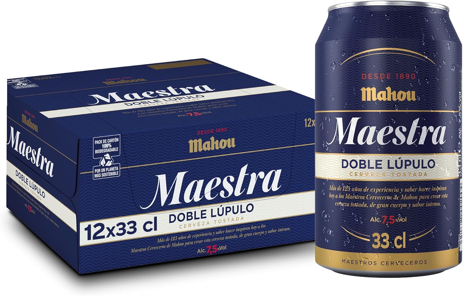 Disfruta del pack de 12 cervezas Mahou Maestra, cada lata de 33 cl ofrece un sabor intenso y tostado que deleitará tu paladar. Con un 7.5% de alcohol y una espuma cremosa, son ideales para compartir en cualquier ocasión.