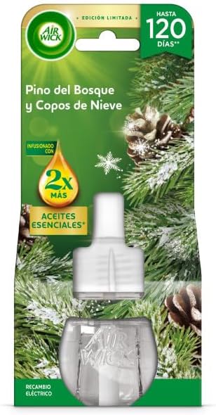 Transforma tu hogar con este pack de 3 recambios de ambientador eléctrico Air Wick. Disfruta de la refrescante fragancia a Pino del Bosque y Copos de Nieve, diseñada para durar hasta 120 días por recambio. Cada recambio está infusionado con el doble de aceites esenciales, garantizando una experiencia aromática intensa y natural. Además, su envase libre de plástico cuida del medio ambiente.