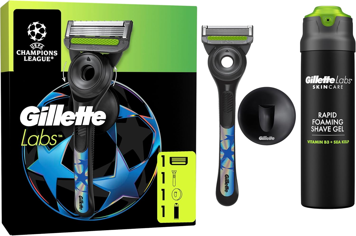 Descubre el Pack Gillette Labs Especial UCL, diseñado para ofrecerte un afeitado impecable. Incluye una maquinilla de afeitar con tira exfoliante, un gel de afeitar de 200 ml y un práctico colgador. Todo lo que necesitas para un cuidado personal de calidad.