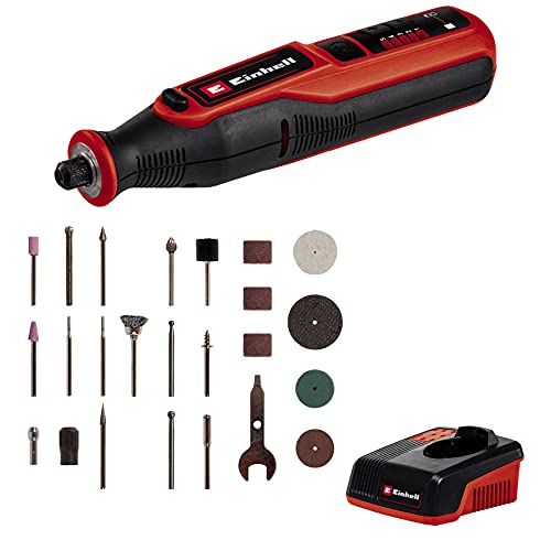Esta lijadora/grabadora eléctrica de Einhell cuenta con una batería de 7,2 V y velocidad ajustable de 5500 a 26000 min-1, perfecta para lijar y grabar con precisión. Viene con 57 accesorios y una práctica caja de almacenamiento.