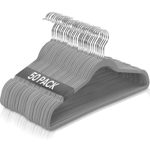 50 perchas de terciopelo en color gris. Antideslizantes y suaves. Diseño delgado que ahorra espacio.