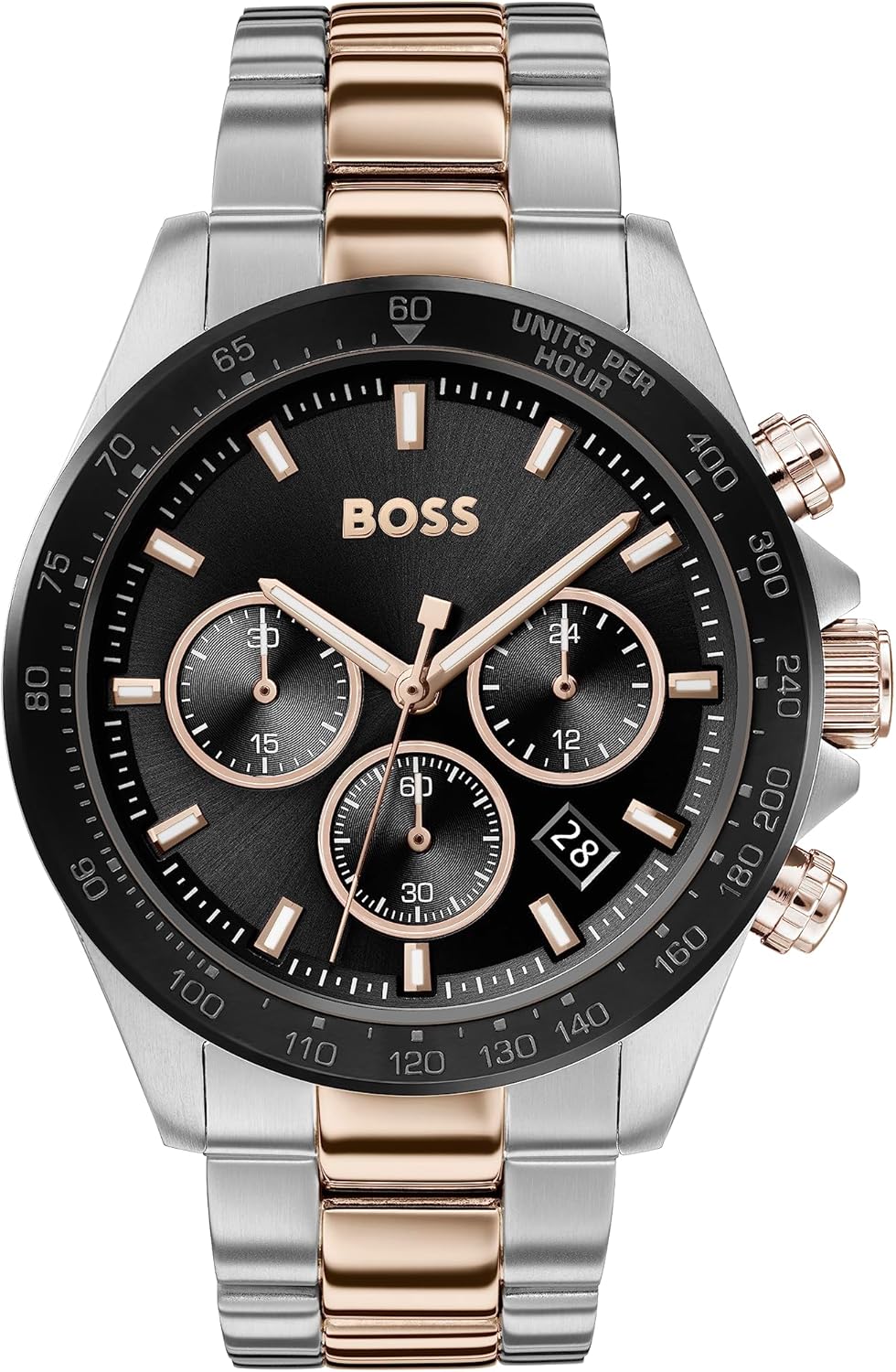 Descubre el elegante reloj BOSS Cronógrafo de 43 mm de la Colección HERO. Con un diseño atractivo en dos tonos (gris y oro rosa), este reloj ofrece una pulsera de acero inoxidable o malla para una máxima comodidad. Además, cuenta con función de cronógrafo, fecha y es resistente al agua hasta 5ATM. Ideal para quienes buscan un accesorio que combine estilo y funcionalidad.