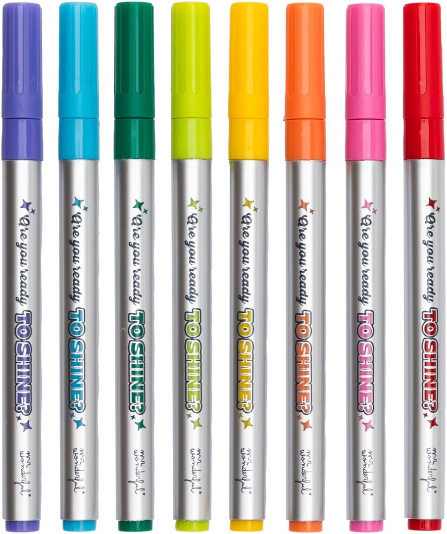 Descubre la magia de los rotuladores metalizados de Mr. Wonderful, un set de 8 unidades perfectas para darle un toque especial a tus proyectos de scrapbooking, manualidades o decoración. Con su tinta de alta pigmentación, disfrutarás de un trazo suave y un brillo que resalta en cualquier superficie. ¡Haz que cada creación brille!