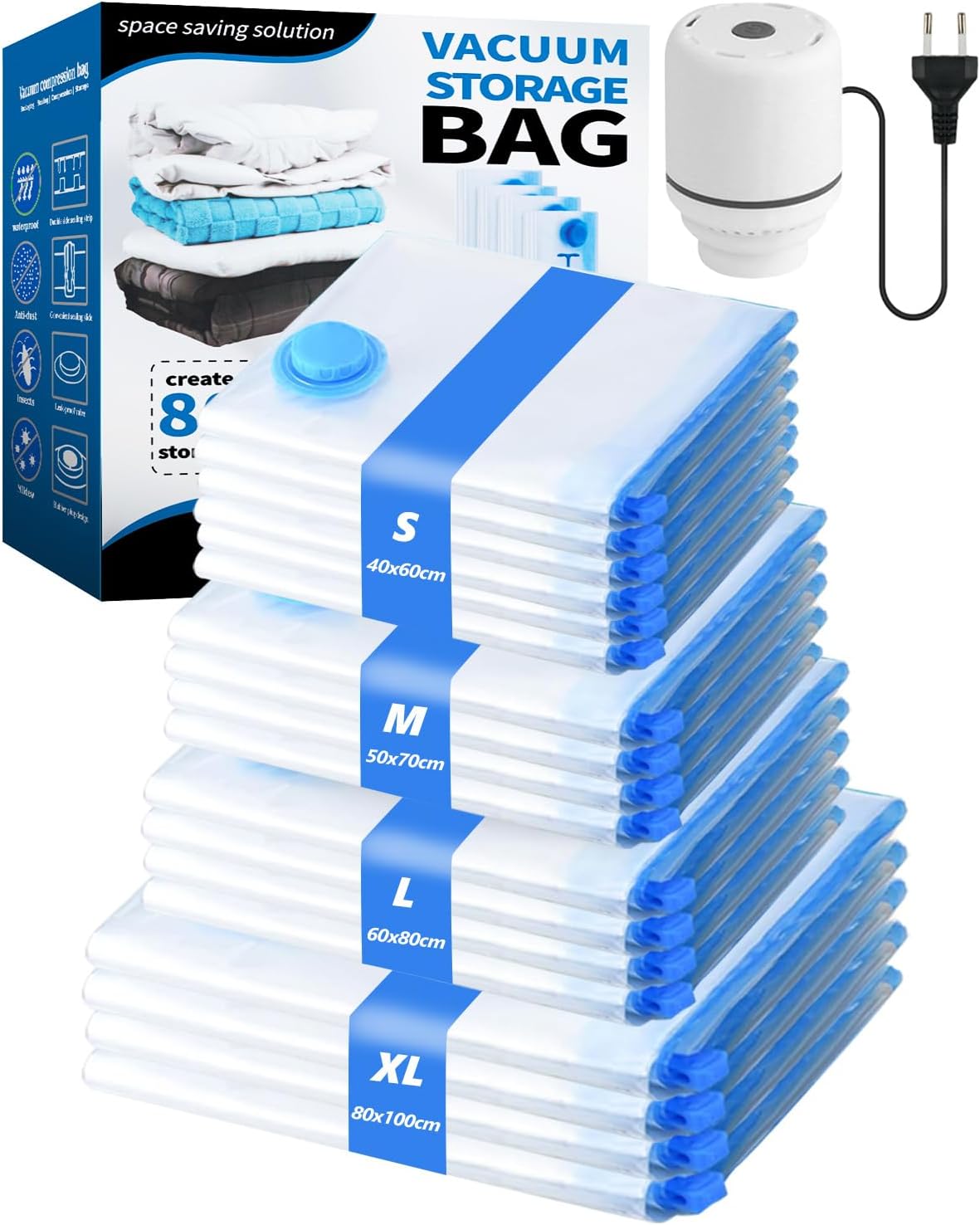 Descubre la solución perfecta para tu almacenamiento: este set incluye 18 bolsas al vacío para ropa de diferentes tamaños, ideales para proteger y organizar tus prendas. Las bolsas son gruesas e impermeables, lo que garantiza que tu ropa se mantenga en óptimas condiciones. Además, ¡viene con una bomba eléctrica para facilitar el proceso!