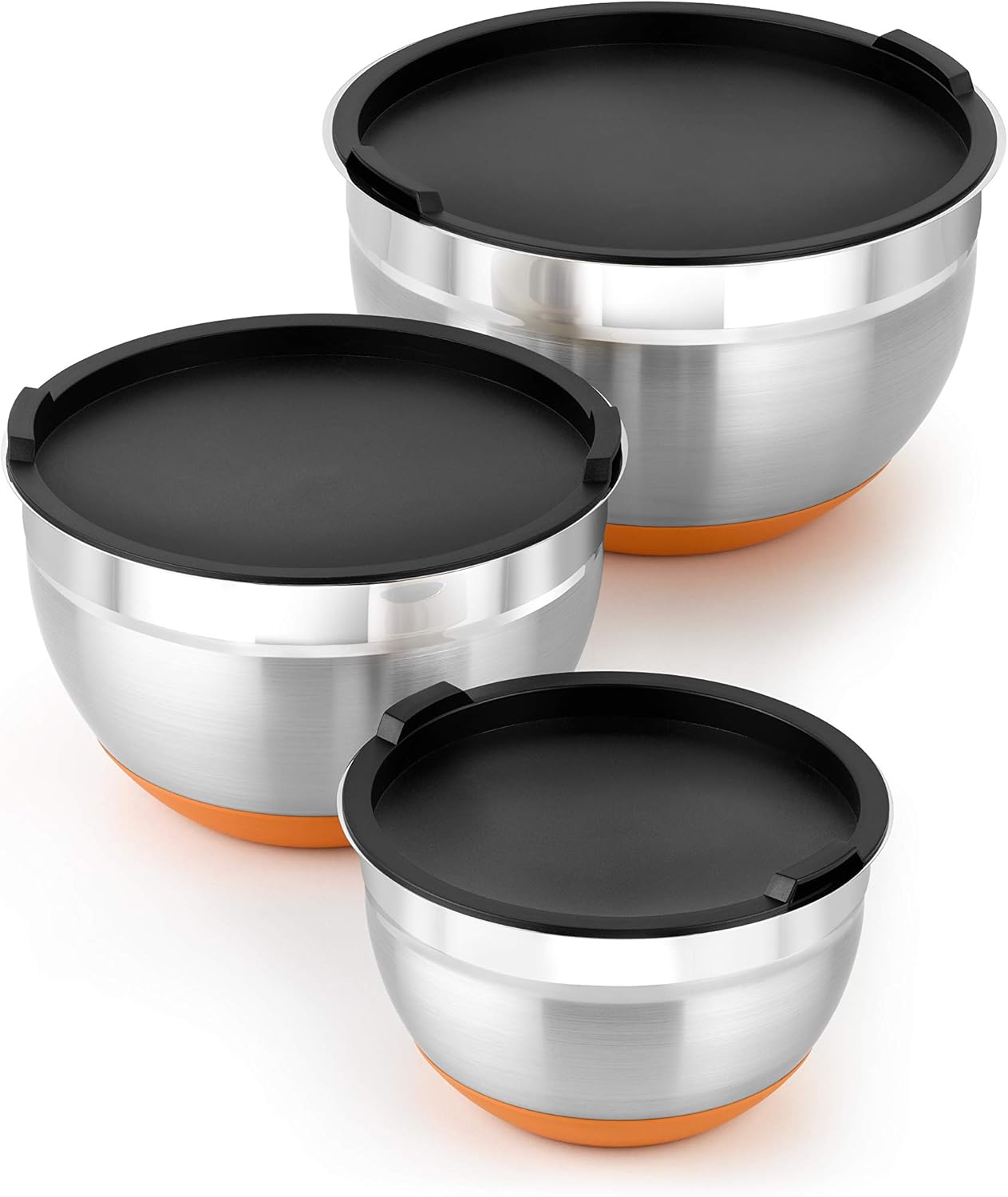 Boles de acero inoxidable y silicona, tapa para cada tamaño, aptos para lavavajillas, diseño funcional.