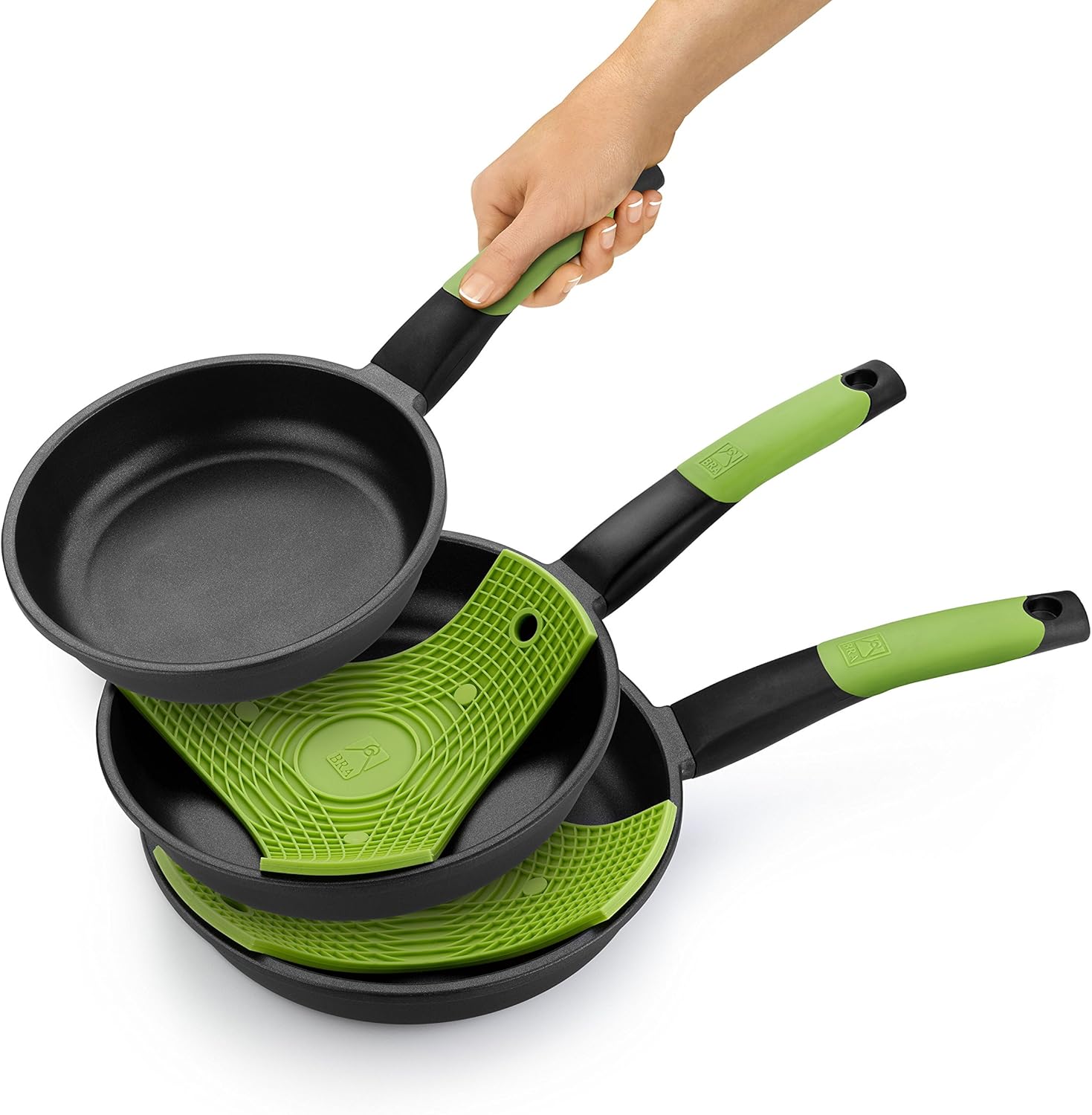 Set de 3 sartenes de diferentes tamaños, material antiadherente, incluye trivets seguros, apto para inducción.