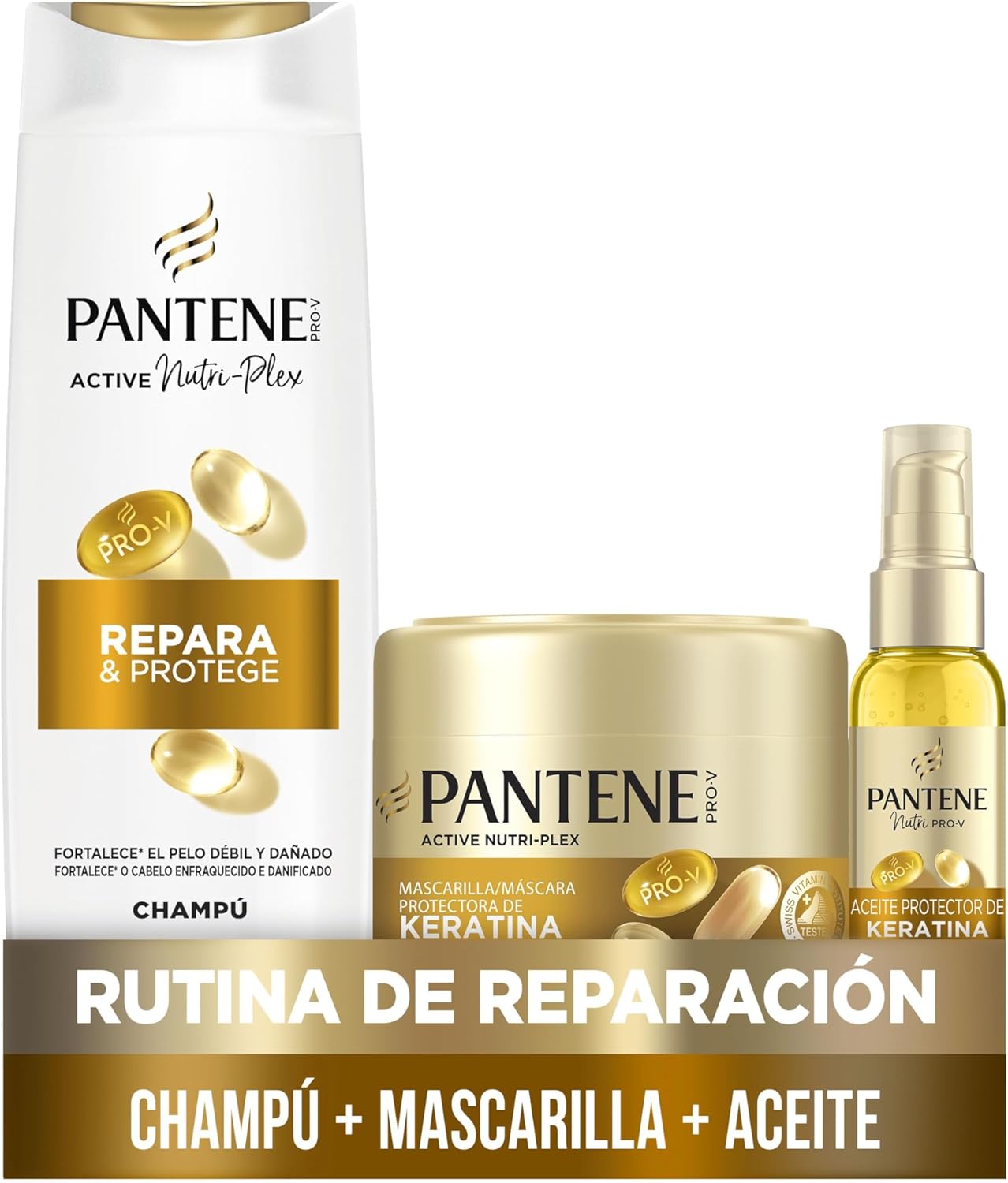 Transforma tu cabello con este completo set de cuidado capilar. Incluye un champú reparador de 325ml, una mascarilla protectora de keratina de 300ml y un aceite protector de keratina de 100ml. Todo lo que necesitas para revitalizar tu pelo seco y dañado, dejando tu melena suave y brillante.