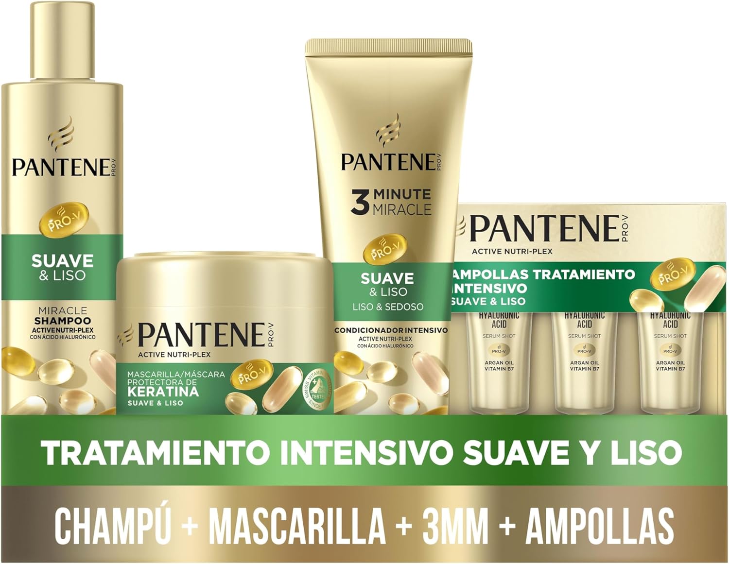 Descubre el set Pantene Pro-V Suave y Liso, ideal para mantener tu cabello en perfectas condiciones. Incluye un champú de 250ml, una mascarilla protectora de keratina de 300ml, un acondicionador de 220ml y 3 ampollas de tratamiento intensivo de 15ml cada una. Perfecto para quienes buscan un cabello suave, liso y lleno de vida.