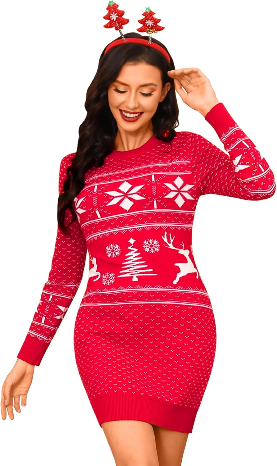 Descubre este encantador vestido suéter navideño para mujer, confeccionado en un suave y cálido punto, ideal para los días fríos de otoño e invierno. Su elegante diseño de manga larga y cuello redondo, adornado con festivos motivos como copos de nieve y renos, lo convierte en la opción perfecta tanto para un look casual como para celebraciones especiales. No te pierdas la oportunidad de lucir fabulosa estas fiestas.