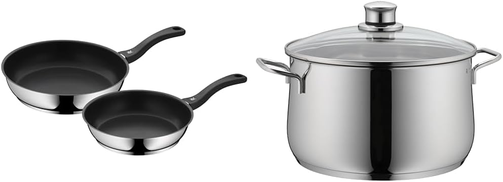 Descubre el juego de cocina WMF que transformará tus comidas. Incluye dos sartenes antiadherentes de 24 y 28 cm, perfectas para cualquier receta, y una olla baja Diadem Plus de 6.5L, fabricada en acero inoxidable con tapa de cristal. Ideal para disfrutar de una cocción saludable y deliciosa.